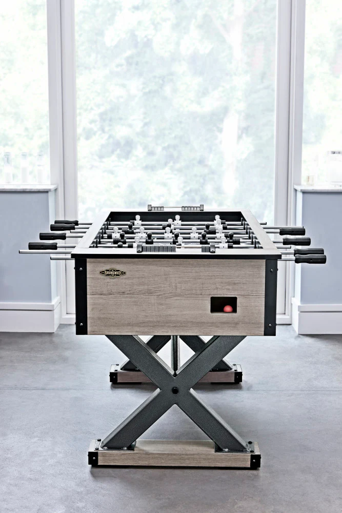 The Brunswick Premier Foosball Table is a heavy duty residential luxury industrial table designed for durability and style. Featuring a three man counterbalanced goalie line, heavy duty weathered oak laminate cabinet, steel legs, and easy to assembly cabinet the Premier foosball is a best seller!