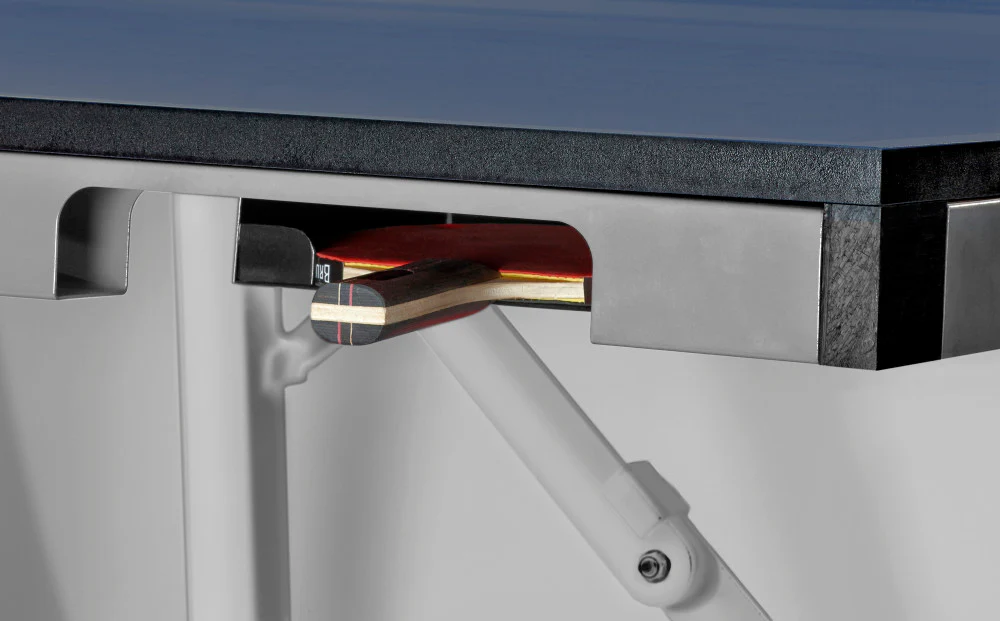 Our mid-range model features a dynamic blue playing surface with matching net and net clips. The 18mm-thick playing field provides great stability and performance while built in compartments grant convenient storage for the included two paddle / 3-ball accessory set. The table features a durable, mobile design with fold-up capability for easy storage.