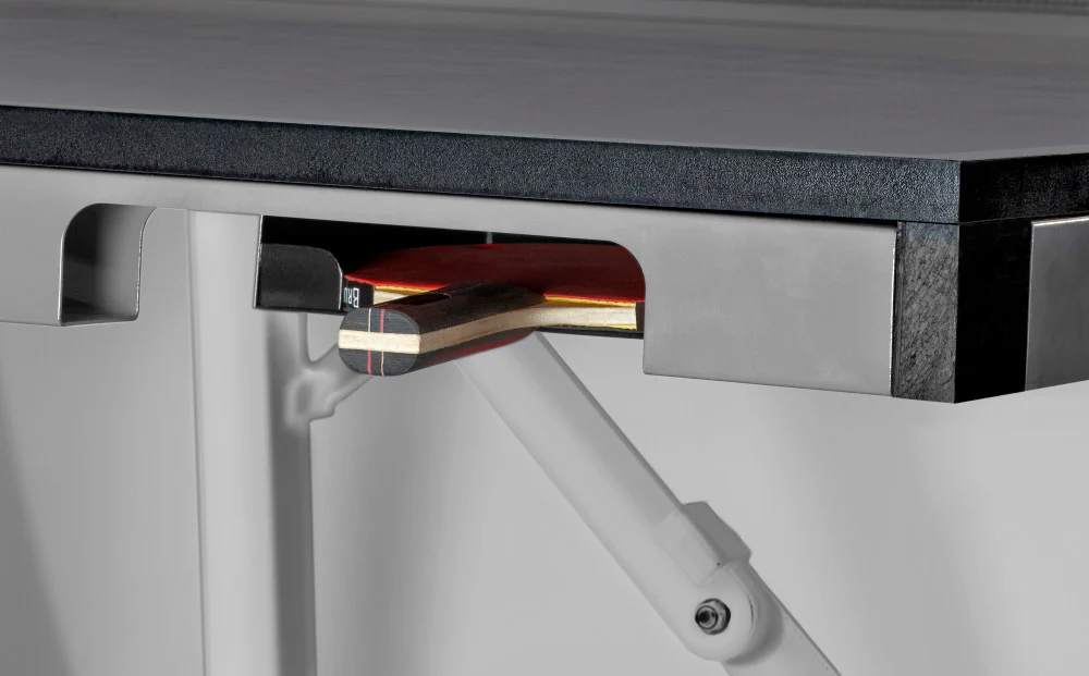 Our latest entry into the table tennis game is as powerful as its name suggests. Smash 7.0 features a classic black play surface, matching net and net clips, with a sturdy 25mm-thick playing field for optimized performance. A strong undercarriage ensures exceptional strength and stability, while the easy fold-up system makes moving and storage quick and convenient. Smash 7.0 provides built in compartments for convenient storage of the included two paddle / 3-ball accessory set.